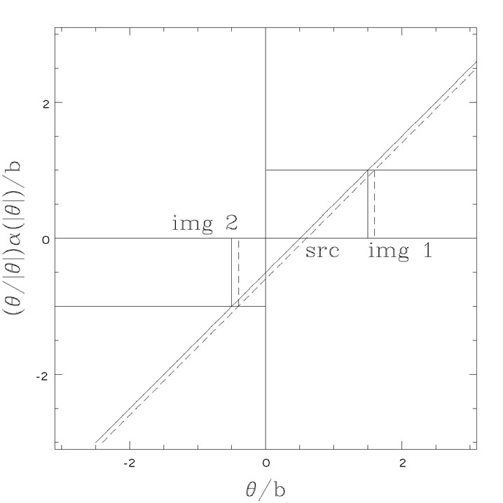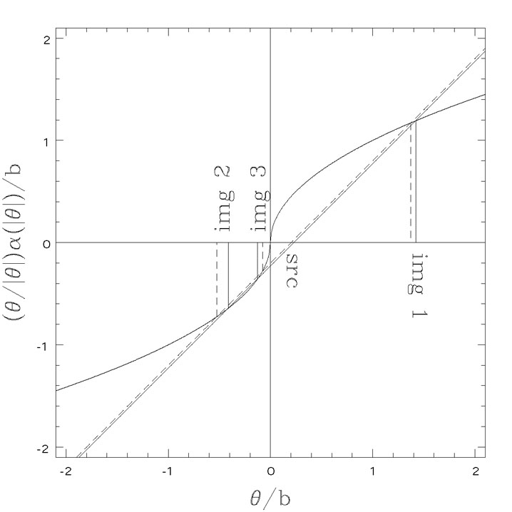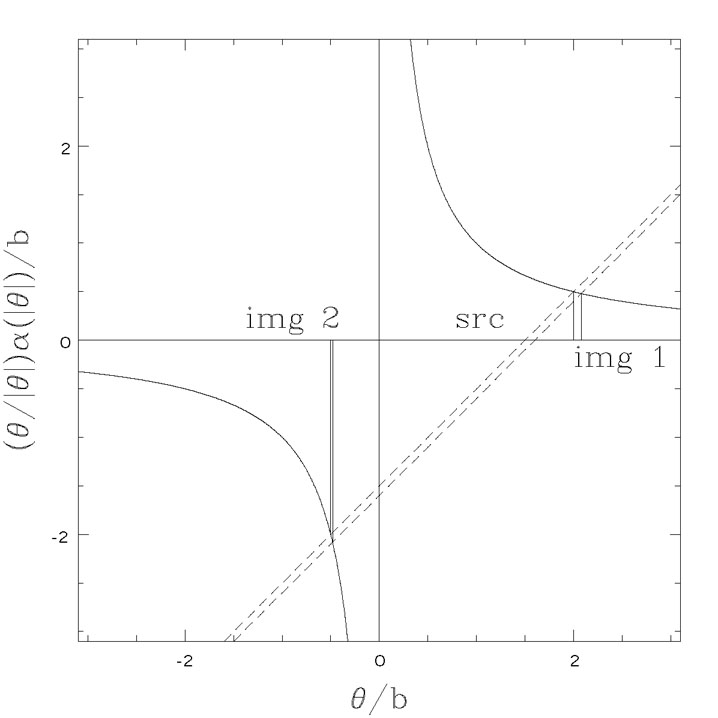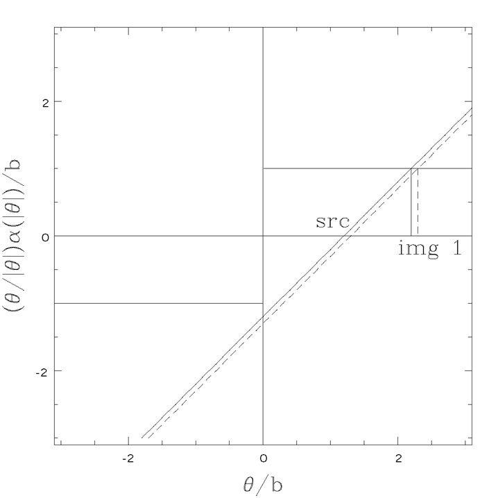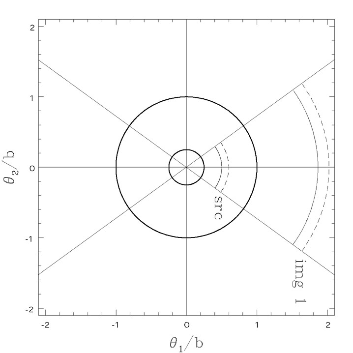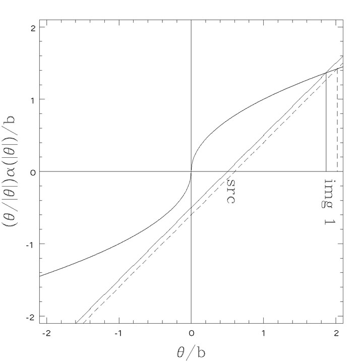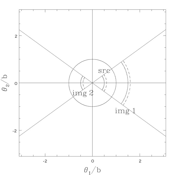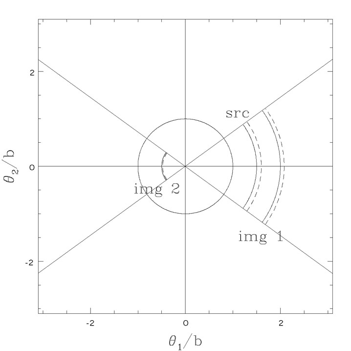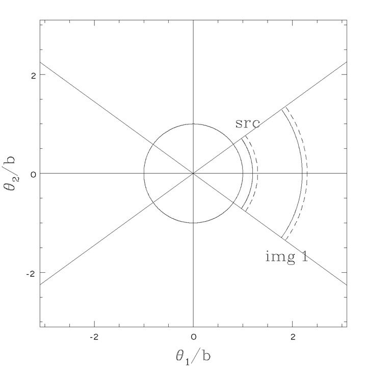 is the characteristic light curve expected for isolated Galactic microlensing events (see Part 4). The point mass lens has one peculiarity that makes it different from extended density distributions like galaxies in that it has two images independent of the impact parameter of the source and no radial caustic. This is a characteristic of any density distribution with a divergent central deflection (n > 2).