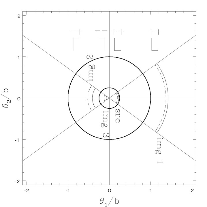 In Fig. B.14 we also illustrate the geometric meaning of the partial parities (the signs of the magnification eigenvalues). A source structure (the L) defines the reference shape. Image 1 is a minimum with positive partial parities (+ +) defined by the signs of the tangential and radial eigenvalues. The orientation of image 1 is the same as the source. Image 2 is a saddle point with mixed partial parities (- +) because the tangential eigenvalue is negative while the radial eigenvalue is positive. This means that the image is inverted in the tangential direction relative to the source. Image 3 is a maximum with negative partial parties (- -), so the image is inverted in both the radial and tangential directions relative to the source. The total parity, the product of the partial parities, is positive for maxima and minima so the orientation of the image can be produced by rotating the source. The total parity of the saddle point image is negative, so its orientation cannot be produced by a rotation of the source.