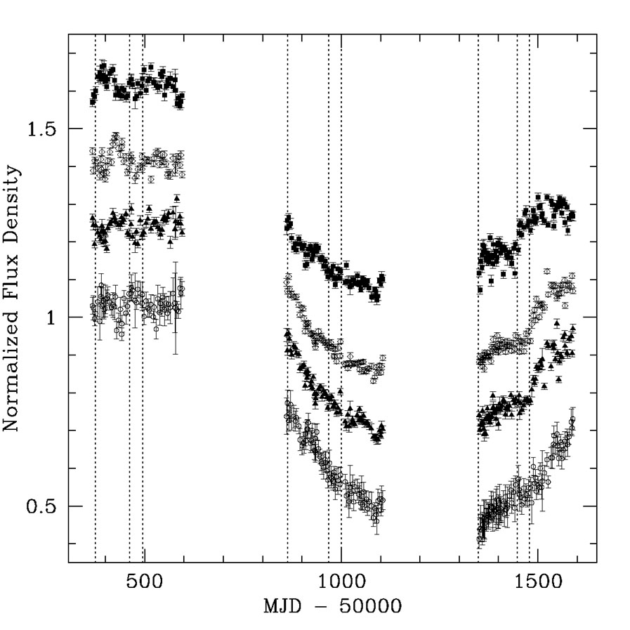 The basic procedures for measuring a time delay are simple. A monitoring campaign must produce light curves for the individual lensed images that are well sampled compared to the time delays. During this period, the source quasar in the lens must have measurable brightness fluctuations on time scales shorter than the monitoring period. The resulting light curves are cross correlated by one or more methods to measure the delays and their uncertainties (e.g., Press et al. [1992a] [1992b]; Beskin & Oknyanskij [1995]; Pelt et al. [1996]; references in Table 1.1). Care must be taken because there can be sources of uncorrelated variability between the images due to systematic errors in the photometry and real effects such as microlensing of the individual images (e.g., Koopmans et al. [2000]; Burud et al. [2002b]; Schechter et al. [2003]). Figure B.35 shows an example, the beautiful light curves from the radio lens B1608+656 by Fassnacht et al. ([2002]), where the variations of all four lensed images have been traced for over three years. One of the 11 systems, B1422+231, is limited by systematic uncertainties in the delay measurements.
