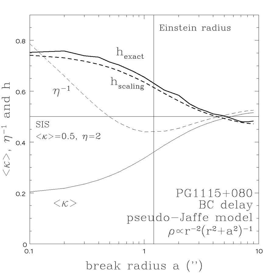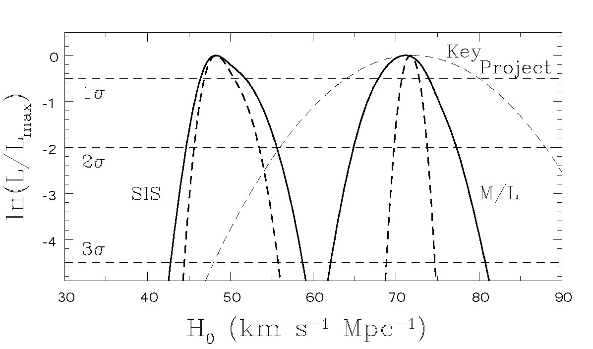 The lens B1608+656 consists of two interacting galaxies, and, as we discussed in Section B.2, this leads to a greatly increased parameter space. Fassnacht et al. ([2002]) used SIE models for the two galaxies to find H0 = 61 - 65 km s-1 Mpc-1, depending on whether the lens galaxy positions are taken from the H-band or I-band lens HST images (the statistical errors are negligible). The position differences are probably created by extinction effects from the dust in the lens galaxies. Like isothermal models of the "simple" lenses, the H0 estimate is below local values, but the disagreement is smaller. These models correctly match the observed time delay ratios. Koopmans et al. ([2003]) obtain a still higher estimate of H0 = 75 ± 7 km s-1 Mpc-1 largely because the lens galaxy positions shift after they include extinction corrections. They use a foreground screen model to make the extinction corrections, which is a better approximation than no extinction corrections, but is unlikely allow precise correction in a system like B1608+656 where the dust and stars are mixed and there is no simple relation between color excess and optical depth (e.g. Witt, Thronson & Capuano [1992]).