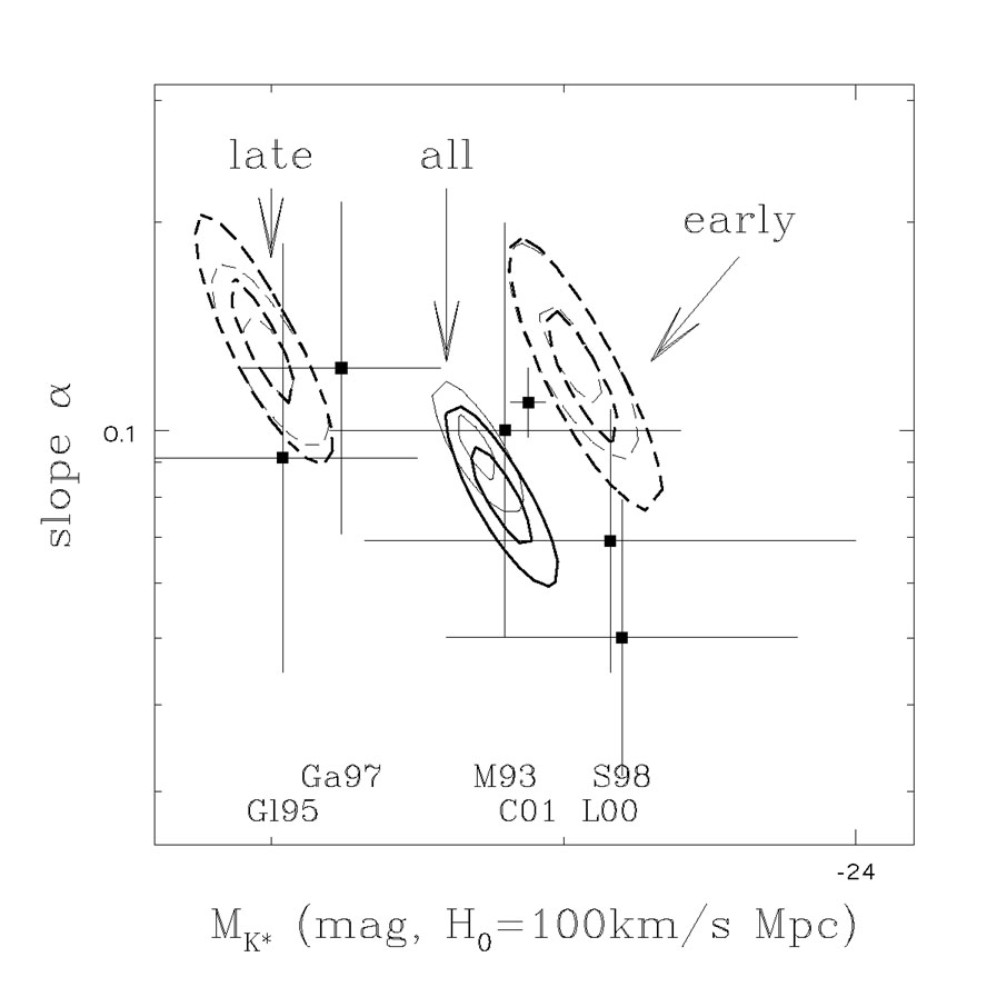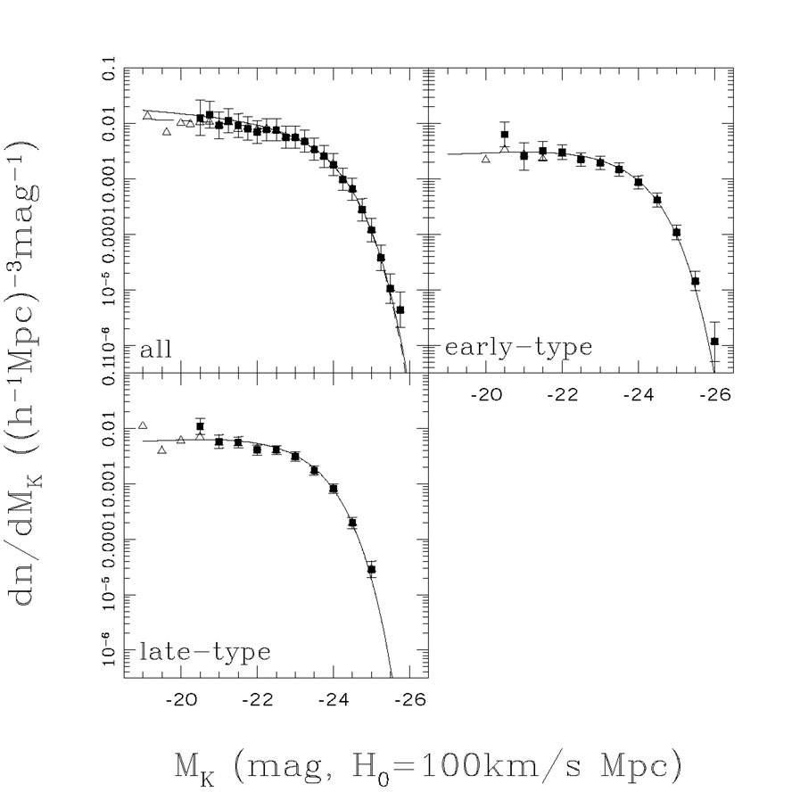 Figure B.39. Example of a local galaxy luminosity function. These are the K-band luminosity functions for either all galaxies or by morphological type from Kochanek et al. ([2001]). The curves show the best fit Schechter models for the luminosity functions while the points with error bars show a non-parametric reconstruction. |