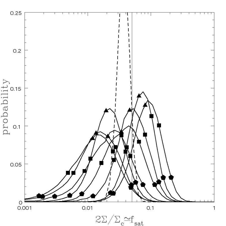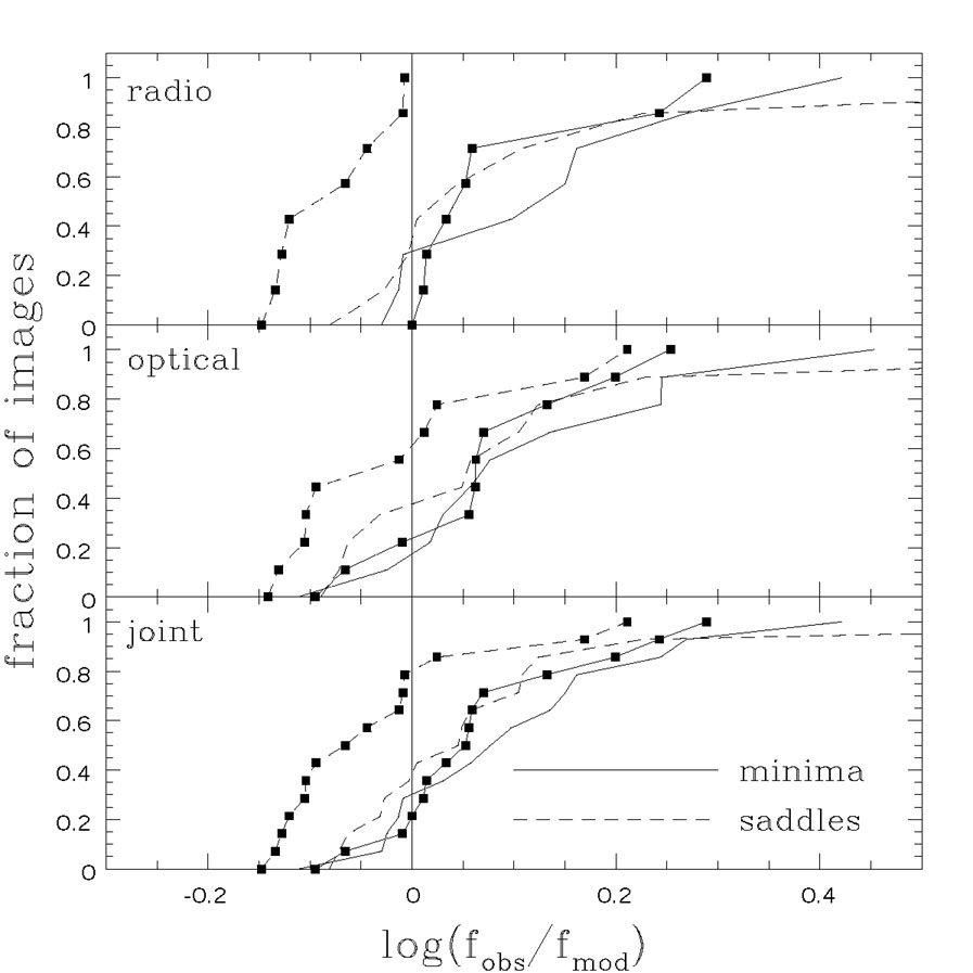 While substructure with approximately the surface density expected from CDM is consistent with the data, it is worth examining other possibilities. We would expect any effect from the ISM to be strongly frequency dependent (whether in the radio or in the optical). At least for radio lenses, Kochanek & Dalal ([2004]) found that the optical depth function needed to explain the radio flux anomalies would have to be gray, ruling out all the standard radio suspects. We would also expect propagation effects at radio frequencies to preferentially affect the faintest images because they have the smallest angular sizes - remember that more magnified images are always bigger even if you cannot resolve the change in size. The ISM also cannot discriminate between images based on parity - the ISM is a local property of the lens and the parity is not, so they cannot show a correlation. Hence, if radio propagation effects created the anomalies they should be the same for minima and saddle points and more important for the fainter than the brighter images. Fig. B.61 shows the cumulative distributions of flux residuals for radio, optical and combined four-image lens samples from Kochanek & Dalal ([2004]). The bright saddle point images clearly have a different distribution in each case, as we would expect for substructure but not for the ISM. The Kolmogorov-Smirnov test significance of the differences between the most magnified saddle points and the other three types of images (brightest minimum, faintest minimum, faintest saddle) is 0.04%, 5% and 0.3% for the radio, optical and joint samples respectively. The next most discrepant image is the brightest minimum, also as expected for substructure, but with less significance. Various statistical games (bootstrap resampling methods of estimating significance or testing for anomalies) always give the same results. Thus, the ISM is ruled out as an explanation.