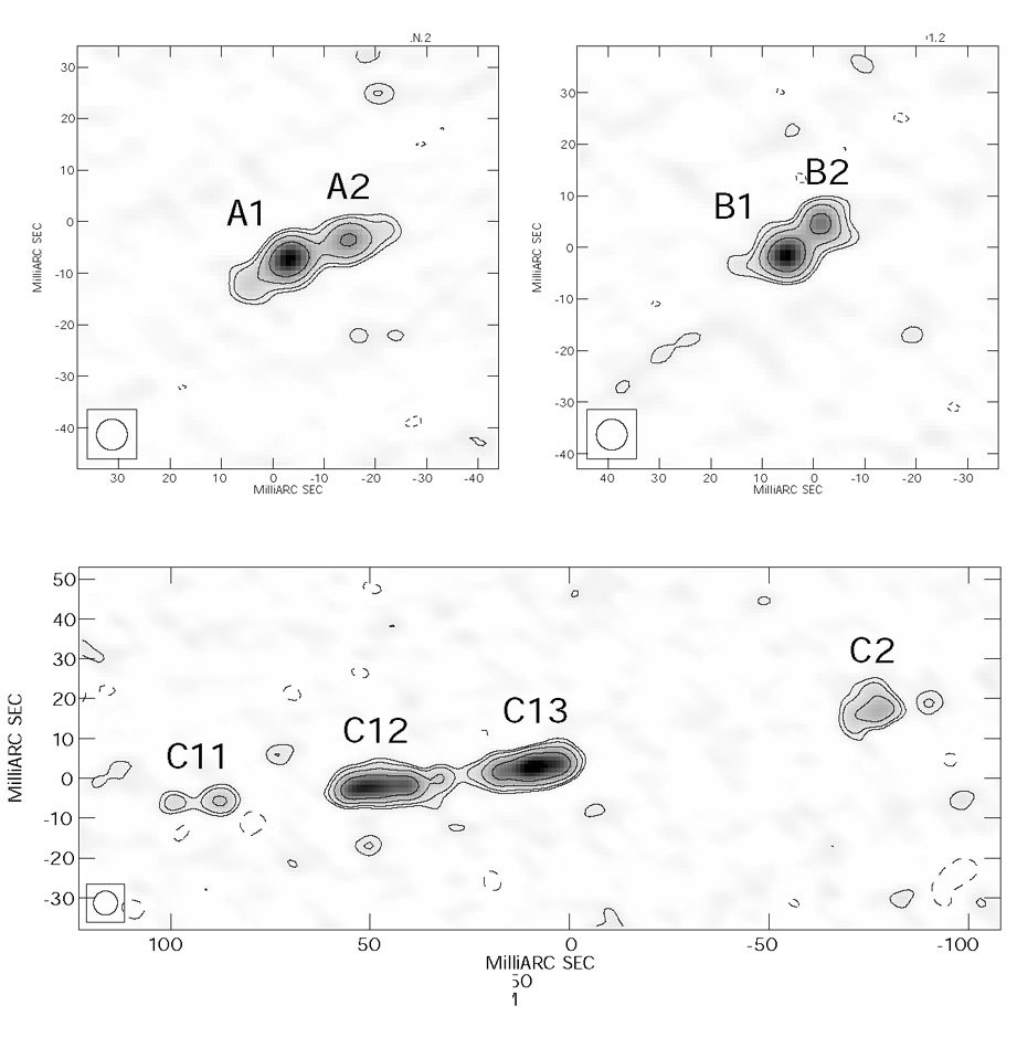 Figure B.63. VLBI maps of MG2016+112 (Koopmans et al. [2002]). The large difference in the C11 / C12 separation as compared to the C13 / C2 separation is the clearest example of an "astrometric" anomaly in a lens. The critical line passes between C12 and C13 and by symmetry we would expect the separations of the subcomponents on either side of the critical line to be similar. In this case the cause of the asymmetry seems to be a galaxy D about 0."8 South of the C image (see Fig. B.6). Galaxy D has the same redshift as the primary lens (Koopmans & Treu [2002]). |