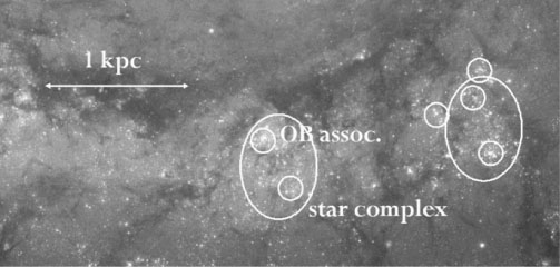 The hierarchy of star formation begins on the scale of Jeans-mass cloud complexes. Giant molecular clouds (GMCs) form by molecular line shielding and condensation inside these giant clouds, and star complexes build up from the combined star formation (Elmegreen & Elmegreen 1983). Each GMC makes a single OB association at any one time. Hierarchical structure has been known to be important in star-forming regions for a long time (e.g., Larson 1981, Feitzinger & Galinski 1987). Early reviews of large-scale hierarchical structure are in Scalo (1985, 1990). Interstellar hierarchies have also been thought to have a possible role in the stellar initial mass function (e.g., Larson 1973, 1982, 1991).