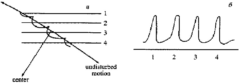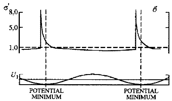 Figure 6. The behavior of interstellar gas in the spiral gravitational field of a galaxy, according to Fujimoto: (a) - the gas motion across the "gravitational washboard", (b) - the ensuing gas density distribution. (The figure is reproduced from Prendergast 1967) |