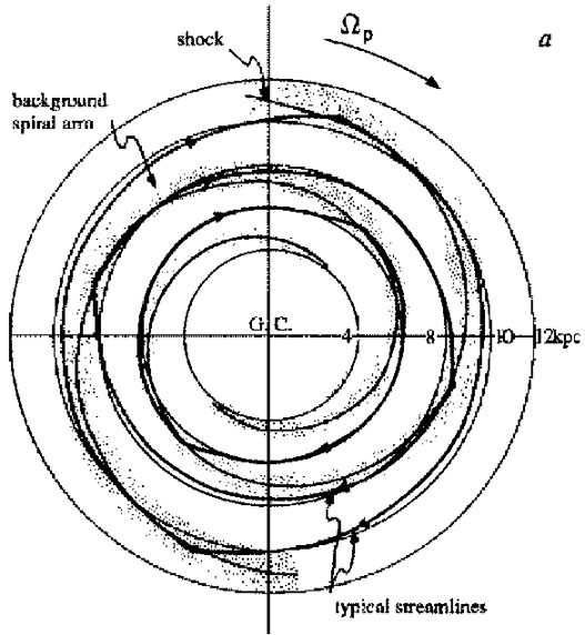 "In the early 1960s, Prendergast often expressed the view that the intense, slightly curving dust lanes seen within the bars of such SB galaxies as NGC 1300 and 5383 are probably the result of shocks in their contained gas, which he believed to be circulating in very elongated orbits. In such `geostrophic' flows of presumed interstellar clouds with random motions, Prendergast (1962, p.220) wrote that "it is not clear what is to be taken for an equation of state", but he knew that "we should expect a shock wave to intervene before the solution becomes multivalued". As regards the normal spirals, Lin and Shu (1964) stressed from the start that since the gas has relatively little pressure, its density contrast "may therefore be expected to be far larger than that in the stellar components" when exposed to a spiral force field such as they had just postulated. That hint remained largely dormant, however, until Fujimoto [...] combined these last two lines of thought" (Toomre 1977, p.453). 37