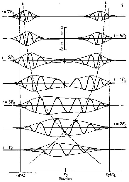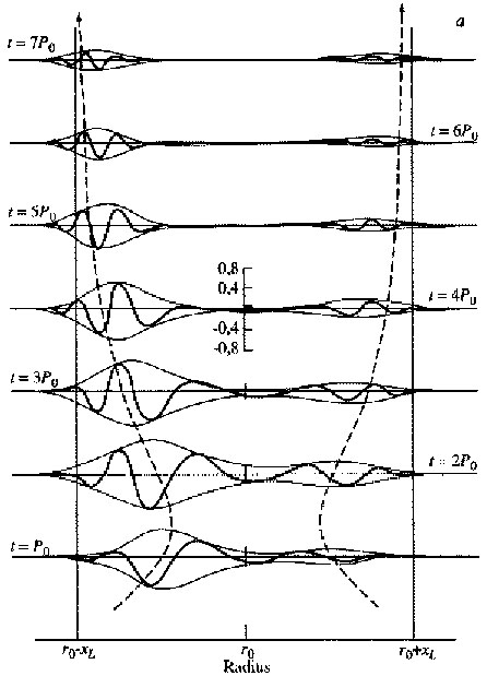 The wave-packet evolution in the threshold Q = 1.0 disk was of particular interest. While the Lin-Shu theory allowed the tightly wrapped waves to reach and touch the corotation circle, it did not know if they could cross it. And these waves showed they really could: the packet readily invaded all the healthy tissue between the ILR and OLR, and even got amplified to a degree, but then the inevitable group drift constricted it like a sausage at x = 0, squeezed it out of that region and took the forming parts to their LR destinations, as in the common case of Q > 1 (Fig.11b). 53
