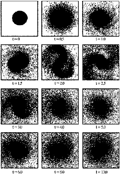 Figure 14. The formation and evolution of the bar-spiral structure in a partially cooled gravitating disk. (The frames are reproduced from Miller et al 1970) |