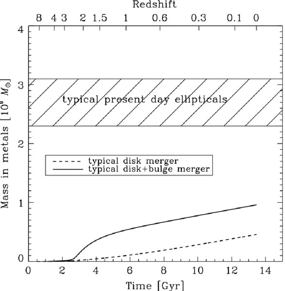 Difficulties with the scenario of ellipticals forming in binary major mergers of disk galaxies include the following: typical ellipticals are more metal-rich than typical present-day disks (see Fig. 4), ellipticals have older stellar populations that seem to form on shorter timescales, and massive ellipticals could not typically have formed from binary mergers of present day disks (while they might form from high-z disks whose descendants no longer exist (e.g., Naab & Ostriker 2009). In addition, binary mergers of any kind are not isotropic, whereas massive ellipticals are.