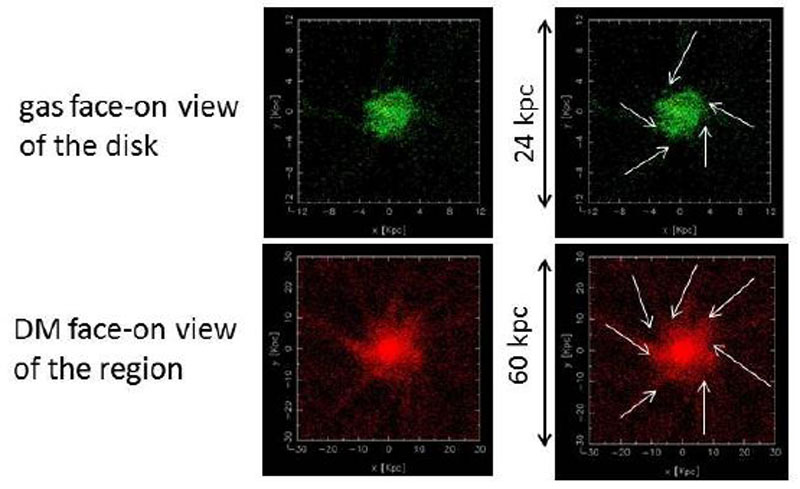 Figure 8. `Cat's cradle' morphology: face-on view of the gas disk (upper frames) and the extended DM regions (lower frames) showing the cold gas inflow joining the disk. The white arrows (right frames) underline the DM filaments and the associated gas inflow. Note that the gas streamlines join the disk at tangent angles which preclude strong shocks from forming and rather assure a smooth unshocked transition flow (from Heller et al. 2007b). |