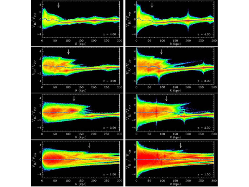 Comparison of the evolution of pure DM and DM+baryon models in the R - vR plane reveals the effect of baryon inflow on the kinematics of the DM halo (Fig. 9 and Romano-Díaz et al. 2009). The mass-averaged radial velocities are negative outside Rvir and lie below the vR = 0 line, and change to positive inside the halo, initially. At later times, the mass-averaged velocity is zero, as the inner halo reaches its virial equilibrium. Both major and minor mergers (substructure) can easily be distinguished by the vertical spikes, and are much more prominent, by a factor of ~ 2, for models with baryons, before the tidal disruption. Moreover, the smooth accretion can be well separated from the substructure. The width of the inflowing stream, which represents the mass accretion flux, declines with time, while that of the rebounding material increases. In the process of tidal disruption, inclined `fingers' form, again more prominent in the presence of baryons. The subsequently forming `shell' structure reveals the insufficient mixing of merger remnants in the form of a R - vR correlation - `streamers', which appear to be long-lived. Streamers formed after z ~ 1 largely survive to z = 0. The phase space also delineates the kinematical differences of the inner DM haloes in these models: note the outline of vR(R) at small radii. This effect can be explained in terms of the gravitational potential shape there, which represents a more centrally-concentrated object.