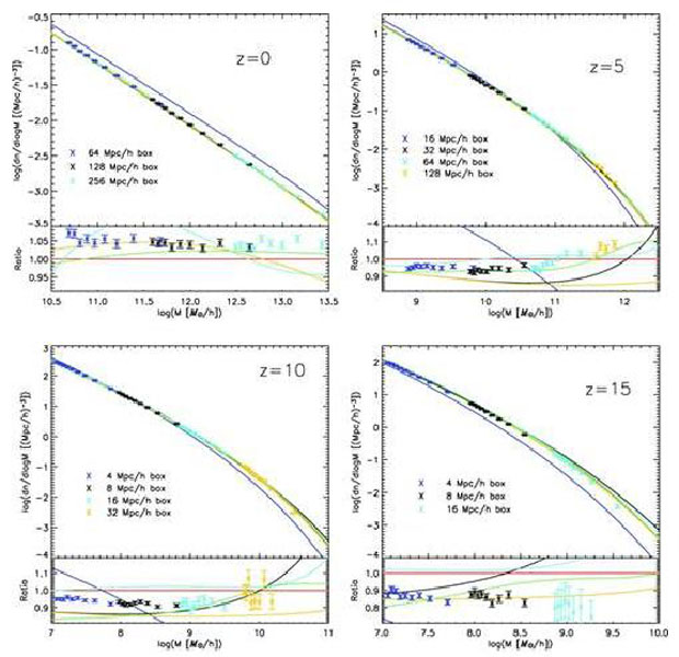 (z = 0, 5, 10 and 15) compared to different fitting formulae,