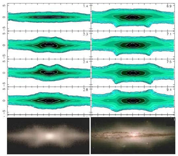 Figure 17. The recurrent buckling instability. Upper frames (from Martínez-Valpuesta et al. 2006): Evolution of the vertical structure in the bar: edge-on view along the bar's minor axis. The length is given in kpc and the values of the projected isodensity contours are kept unchanged. The time in Gyr is given in the upper-right corners. Note the bar flip-flop at 2.3-2.4 Gyr and the persistent vertical asymmetry at 5.2-7.5 Gyr. Lower frames: smoothed version of the above figure at 9.4 Gyr (left), and a matching galaxy from HCG 87 group of galaxies (Hubble Heritage Team), courtesy of J. H. Knapen (right). |