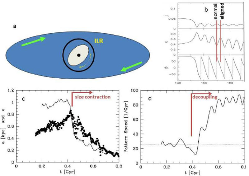 Figure 18. Formation and evolution of nested bars with dissipation (Englmaier & Shlosman 2004): (a) Schematic structure of a nested bar system; (b) Specific angular momentum, ellipticity, and angle between the primary and secondary bars (top to bottom). Note the correlation between the shape and the angle between the bars; (c) Evolution of ellipticity (dotted line) and semimajor axis (thick dots) of the secondary (nuclear) bar during decoupling; (d) Pattern speed of the primary (dotted line) and secondary (solid line) bars during decoupling, in the inertial frames. |